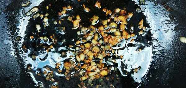 鍋燒熱放油,再放切碎的蒜蓉、蔥碎炒香。