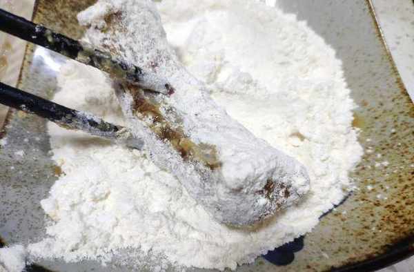 5,裹好蛋液的排骨迅速放到面粉裡面滾一圈,讓排骨全部粘上面粉。