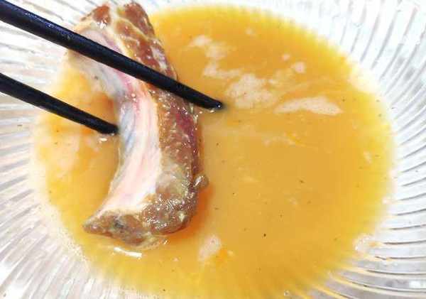 4,煉好的菜籽油大火燒至約100度,關小火。排骨去掉醃料,均勻的裹上一層蛋液。
