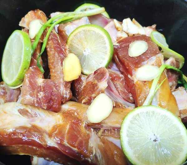 1,排骨洗凈斬約12厘米長,加入蒜米、生薑、醬油、胡椒粉、料酒、白糖、鹽、檸檬片醃制3小時備用。有時間的可以醃制過夜更入味,實在沒時間想現做的,放料足一點醃制20分鐘一樣的香酥可口。