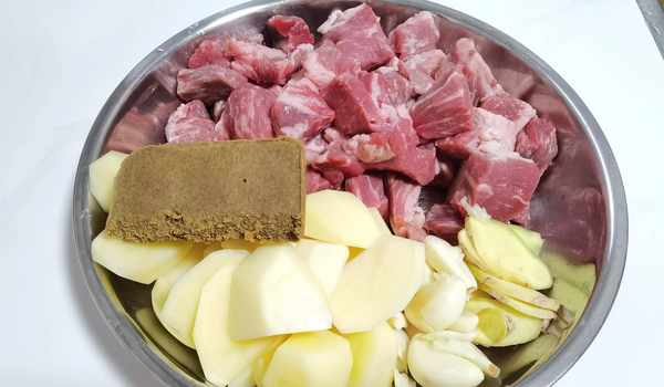 食材準備:牛腩一斤多,土豆兩個,咖喱塊約60g,薑片,蒜瓣適量。