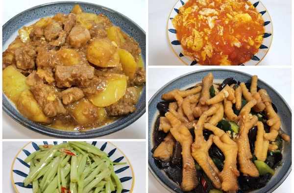 今日菜式:咖喱土豆燜牛腩,酸甜炸蛋,涼拌雜錦,蒜蓉炒通心菜梗