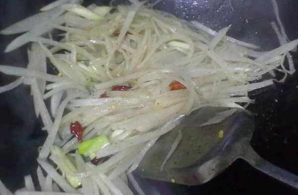 做法:蘿卜洗凈去皮,切成絲狀,備用。註意蘿卜皮不要扔瞭,還可以進行涼拌一下,又是一道菜。紅辣椒洗凈切段,備用。熱鍋,加入適量花生油,待油燒至六、七分熱的時候,放入紅辣椒、蔥花爆鍋。之後加入蘿卜絲,大火快速翻炒1到2分鐘,這個時候可以適量的加入一些清水,當蘿卜絲炒至微微變軟的時候,燜鍋1到2分鐘,加鹽,出鍋。