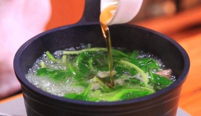2、豬肝醃制好之後要先焯水,鍋中加水燒沸,將豬肝倒入沸水中焯水,焯至豬肝變色,變色後將豬肝撈出,備用。焯水的水倒掉然後重新往鍋中加水燒熱,倒入生薑絲、青菜和豬肝,然後加入適量的香油和食鹽調味,煮湯的話還是不需要太多調味料的,鮮美清淡的湯是最好的,然後火調至小火,煮個3-5分鐘就可以出鍋瞭,一碗清淡營養的青菜豬肝湯就做好瞭。