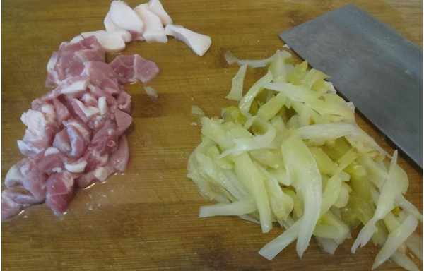2、 準備其他食材:將薑和蒜切成小片、幹辣椒也剪成小段,再將準備好的咸菜切成片狀或絲狀,適量的豬赤肉也切成小塊備用。