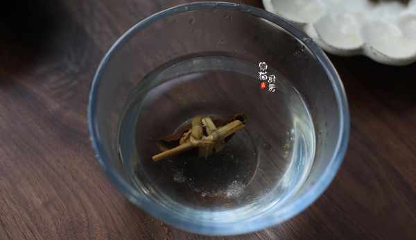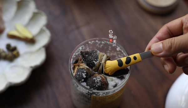 4.再把去掉粗鹽的三寶紮和石斛放入燉盅內。石斛有清熱下火、滋陰潤燥的作用。加2片生薑驅寒暖胃。燉盅隔水蒸燉1-1.5小時。