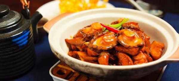 把鮑魚擺放在雞塊上,淋入用各種醬料和清水、料酒、鹽勾兌成的料汁,蓋上蓋子燜燒成熟