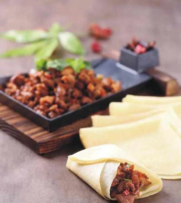 醃制後的羊肉過油至成熟,和過油後的青紅椒末撈拌均勻,用薄餅卷裹即可食用