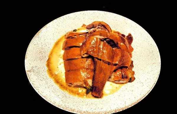 取出鵝肉切成塊裝盤,淋入少許燜鵝的醬汁,用微波爐叮2分鐘即可上桌。