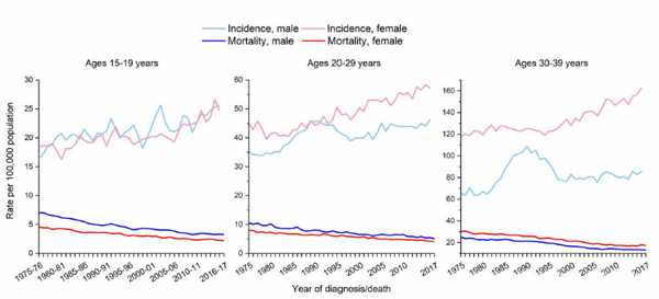 對於15-19歲的青少年,淋巴瘤發病率最高,而對於20-29歲年齡層,甲狀腺癌、睾丸癌和黑色素瘤發病率最高,到了30-39歲,女性乳腺癌、甲狀腺癌和黑色素瘤位居發病率前三。值得一提的是,每個年齡層中發病率排名前三比特的都有甲狀腺癌。