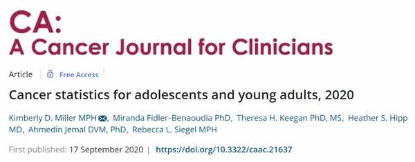 2020年9月17日,全球影響因數的最高學術期刊CA(IF=292)發表了來自美國癌症協會等組織的題為:Cancer statistics for adolescents and young adults,2020(2020年青少年癌症統計)的研究論文。