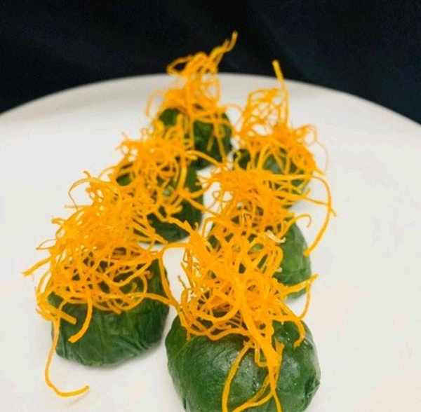 菠菜拌入調料,用一張整個的菠菜葉子包好