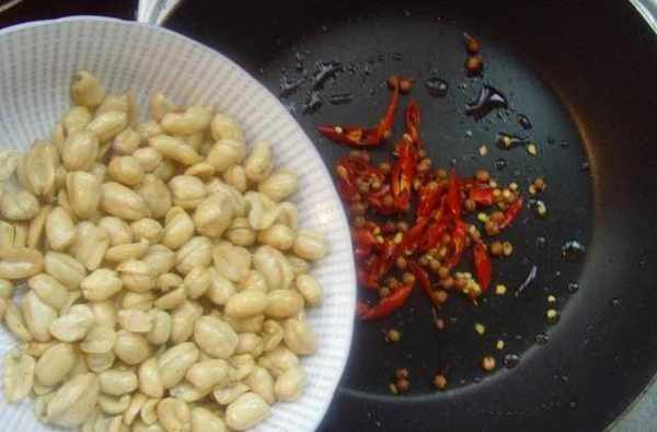 3.鍋中留底油,放入花椒、辣椒段,小火翻炒出香後倒入炸好的花生
