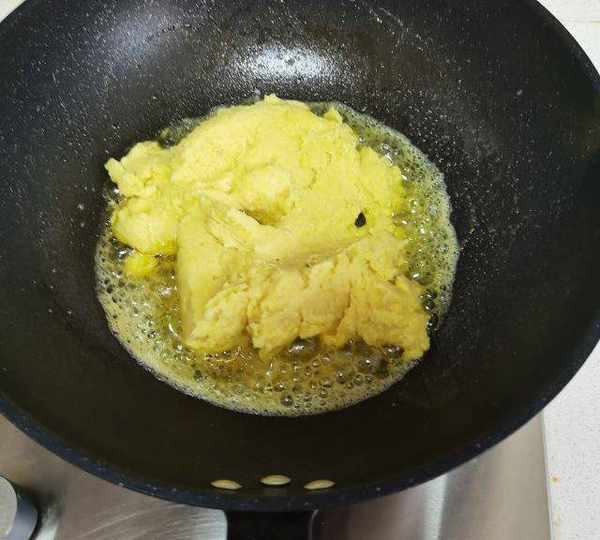 第10步、將綠豆泥放進鍋裡小火翻炒。