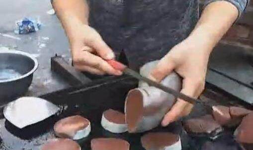 然後把它們放在蒸鍋裡,煮熟之後,切成小片,然後再放在煎鍋裡,婆婆說這道小吃,最好是用豬油來煎,這樣會特別的香,煎瞭一會兒之後,鍋裡的灌腸片就會鼓起來,為瞭防止糊鍋,煎的時候,要翻一翻,然後最後放在盒子裡面,來買的人特別的多,你們見過這種小吃嗎?