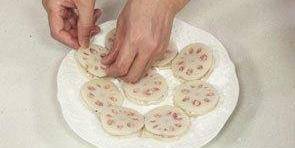 取一大盤,撒上生粉,將藕片擺入盤中,再撒上生粉。