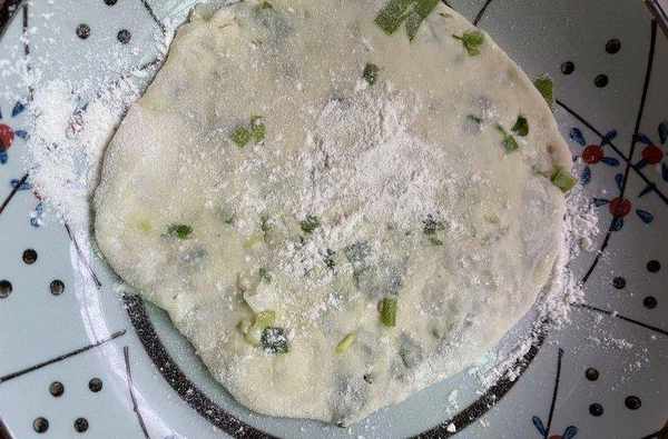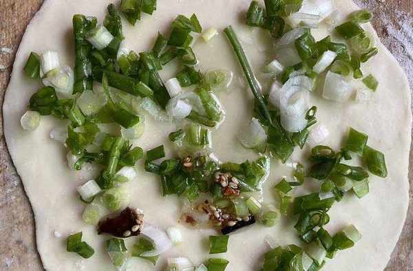 然後把面團分成小份,搟成餅狀,上面撒一點鹽,一些蔥花,一些油
