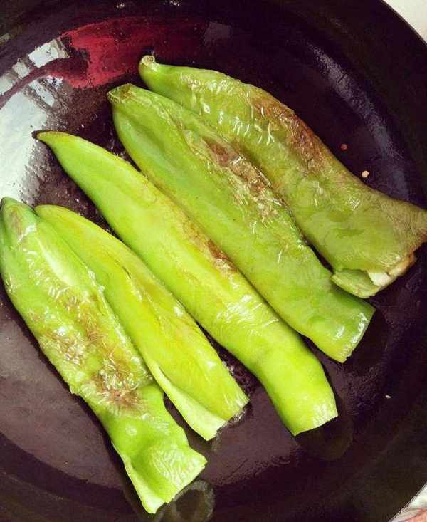3、為瞭讓青椒能夠有明顯的虎皮紋理,可以拿鏟子把青椒壓扁,一方面受熱快,熟得就快,另一方面也能直接燙出紋理,等到一面被煎得起皺之後,就可以翻面瞭,煎到兩面都差不多就可以瞭。