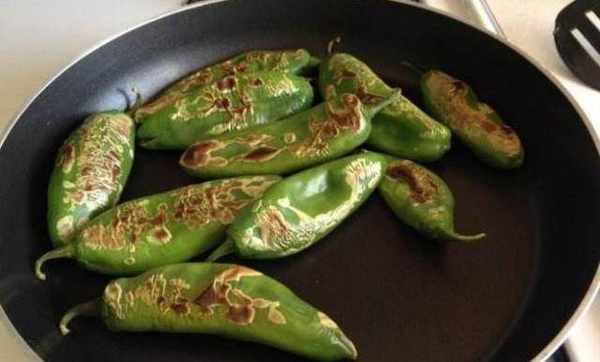 做完這些之後,我們就可以進行第二步瞭。然後將洗幹凈的炒鍋燒幹,等他熱好之後,直接將青椒放在裡面邊壓邊燒。在這裡大傢需要註意的一點,那便是先別急著倒油,等到你又幹鍋,將其幹扁一下之後再下油鍋,這樣做是為瞭能夠澆青椒裡面的水分燒幹,這樣下油鍋的時候更容易起虎皮。