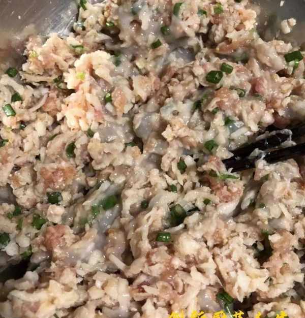 1.將鮮肉(肥三瘦七)去皮剁成肉沫。蓮藕去皮洗凈切片,鍋中燒沸水下入切好的蓮藕片輕燙水再用冷水沖涼,撈出藕片瀝幹水分切碎備用。
