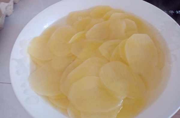 步驟一、把每個土豆削皮後洗幹凈,用模具削成薄片裝入大碗裡加入一點白醋和適量清水浸泡10分鐘。(也可以自己用刀切成薄片)