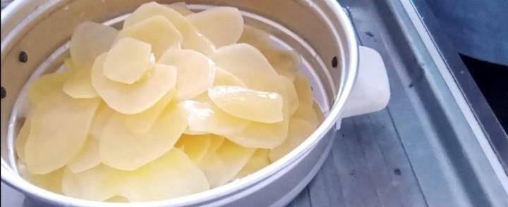 步驟三、將過瞭涼水的土豆片放入蒸鍋裡晾幹水分。