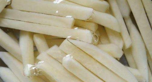 把土豆放在水中清洗也是能夠更好的洗掉那些多餘的淀粉,得等到土豆清洗好以後,我們把土豆條放在清水中浸泡在浸泡的時候,也可以撒上一些食用鹽浸泡的時間,大概10分鐘左右就可以瞭。