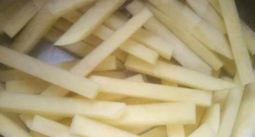 等到土豆選擇好以後,我們把土豆給清洗幹凈,清洗幹凈之後,就可以用削皮刀把土豆的外皮都給削掉,等到消掉以後把土豆切成大小均勻的長條狀,等到土豆條切好以後,把土豆條放在水中進行清洗。