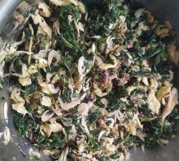 第2步、清理幹凈後開水略焯,後,放在涼水中去去苦味,再攥幹水分。