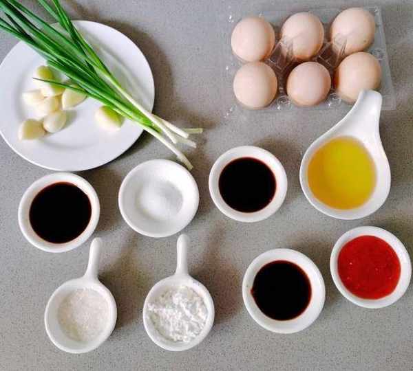 原料:雞蛋、蒜瓣、香蔥、生抽、香醋、甜辣醬、耗油、白糖、淀粉、鹽、食用油。