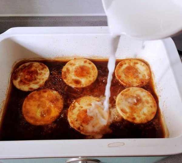 第7步、放入雞蛋,倒入調好的糖醋汁燒開。