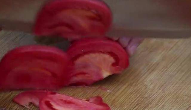 兩個西紅柿對半切開,去掉蒂,先切片,然後再切碎,5毛錢的手工面條切碎,起鍋燒到油熱,加入蔥薑末炒香,加入西紅柿碎炒出汁水,加入紅薯丁繼續的攪和,加入適量的清水,加生抽少許的老抽,耗油、黑白胡椒粉攪和,然後大火煮開。