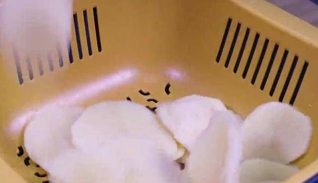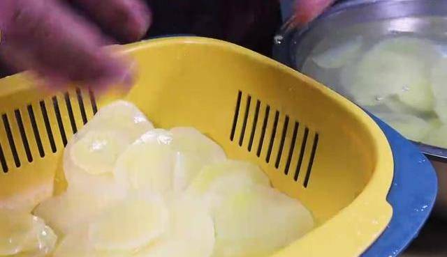 今天和大傢分享的是自制薯片,先把孝和皮洗幹凈的土豆切薄片,多沖洗幾遍,裡面的淀粉,我都這樣放在熱水中燙兩三分鐘撈出,燙的時間不能太長。