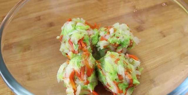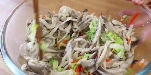 放入蘑菇焯水三分鐘去除草酸,蘑菇煮熟以後也撈出來過一下涼水。把白菜胡蘿卜擠出水分放到大碗裡。蘑菇的水分也擠出來,擠幹一點,翻拌均勻。再放入晾涼的花生米,澆上調好的料汁翻拌均勻,充分拌勻以後裝到一個大一點的碗裡,然後蓋上一個盤子翻轉過來,取下盤子,這樣一道好吃好看又營養的涼菜就做好瞭。