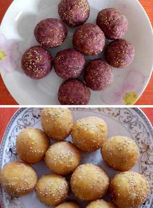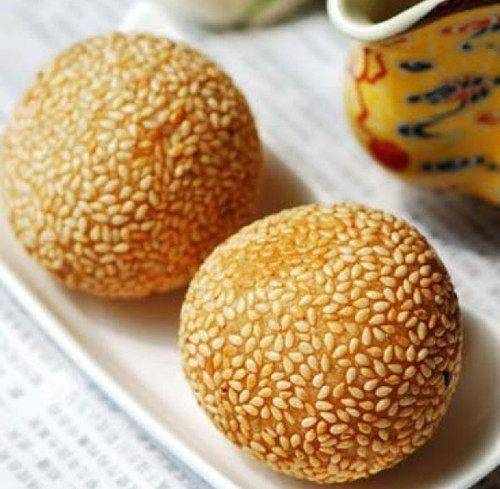 第六步:鍋時放植物油燒開,把包好的芝麻球分別放到油鍋裡炸至金黃色即可以出鍋食用,這款芝麻球不管是平時當甜點食用或過年過節招待親友都是特別的上檔次。