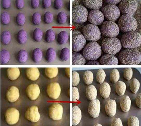 第五步:分成大小相同的劑子,搓圓,桿皮,加入蓮蓉餡捏緊,再搓圓,放入芝麻中滾上一層芝麻。