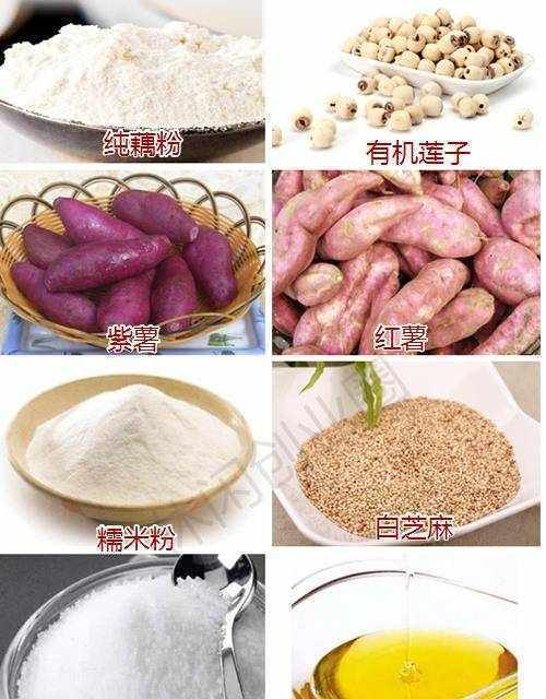 純藕粉,有機蓮子,紫薯,紅薯,糯米粉、白芝麻,白糖,植物油