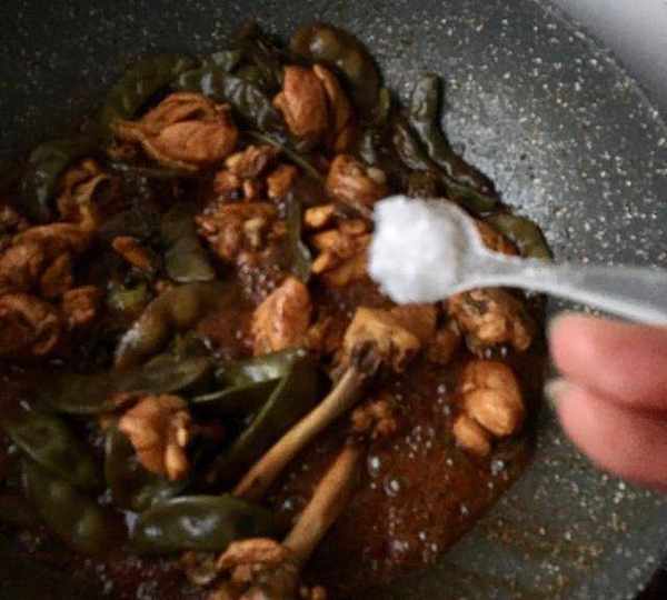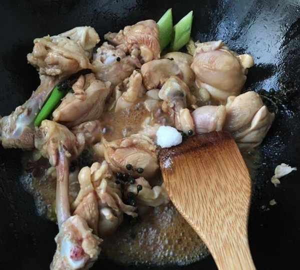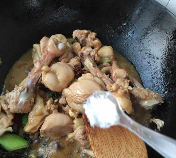 第16步、蓋鍋蓋,大火燒開,中火燉煮至湯汁不快收幹放雞精。