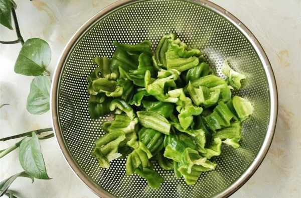 1.洗凈青椒,瀝幹水分,去掉青椒的莖和種子,然後用手將青椒切成碎片。