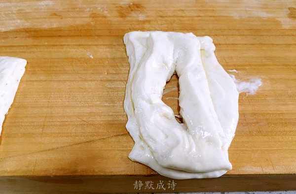 5、也可以把兩個面片疊在一起,中間用刀割開不割斷,下鍋前抻長,如圖。