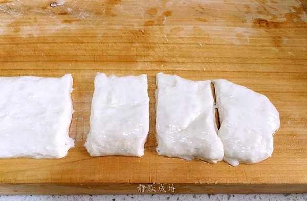4、用刀切開成均勻的段,同時把油鍋燒熱。用手拿起一個小面片,兩手分別攥住兩頭,抻長到合適的長度,就可以下鍋瞭。註意:抻的過程中請留意它的厚度和您傢鍋的直徑,太厚瞭油條就成瞭面疙瘩,太薄瞭油條內部不柔軟。