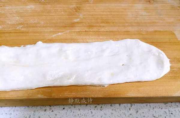 3、案板上抹少量油(防粘),用刀或刮板從面盆裡割下一長條面團,放在案板上,用手抻長並且按壓平整,如下圖。請註意,面團餳發好以後就不要再揉面瞭,千萬不要再揉,不然面團就白白餳發瞭,炸不出口感蓬松的好吃的油條來。而且,抻長的面片也不能過薄,那樣抻長後再炸出來的油條過幹發硬,當然如果您喜歡那樣的口感就例外啦!