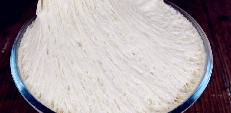 面團發酵好之後有豐富的蜂窩孔,我們先用筷子給它攪拌排氣,順著一個方向攪拌,給它充分的排氣;