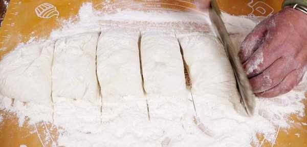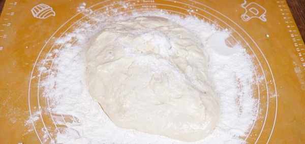 然後在案板上撒上大量的面粉,把排氣之後的面團倒在面粉上,因為面團比較軟,這樣能很大程度的防粘;