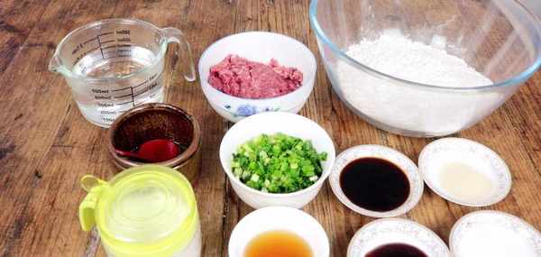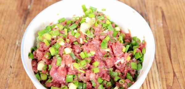 醒面的時候我們來準備肉餡,往準備好的肉沫裡面加1小勺鹽、1勺料酒、2勺生抽、1勺耗油、1勺食用油,給它攪拌均,需要順著一個方向攪拌,肉餡攪拌好之後加入蔥花, 攪拌均勻,這樣肉餡就調好瞭;