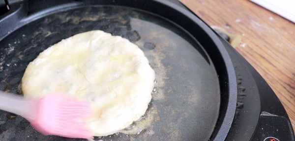 電餅鐺提前預熱,加適量的食用油,把餅坯放進去,稍微壓扁,上面再刷一層油,鎖住水分,蓋上蓋子烙2分鐘,然後翻面,再烙2分鐘,來回多翻面幾次,等兩面金黃,肉餅就能出鍋瞭,這樣柔軟的發面肉餅就做好瞭;