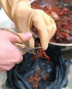 用剪刀剪去小龍蝦頭部以及8隻小腳,記得戴個手套,用手抓住小龍蝦頭部以防被夾傷