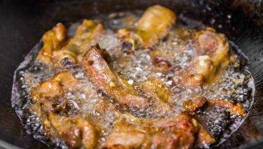 第五步:我們將已經蒸好的排骨取出後用廚房用紙將它表面的水分擦幹。然後我們起鍋倒入適量的食用油,等到油溫燒至七成熱的時候,倒入排骨炸兩到三分鐘,將排骨表面炸至金黃之後就可以撈出控幹油分備用瞭。