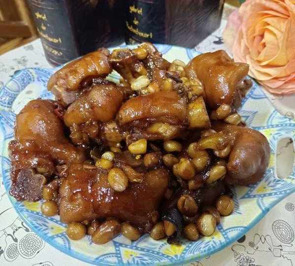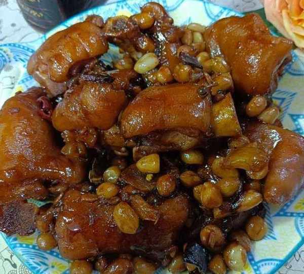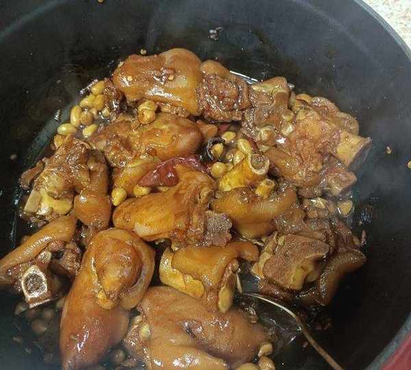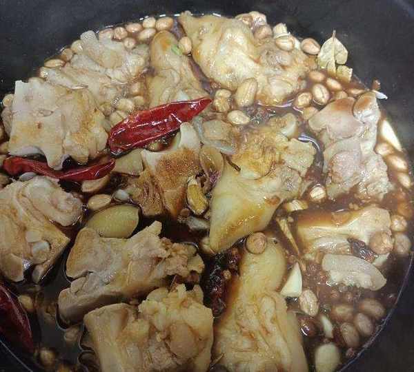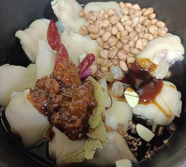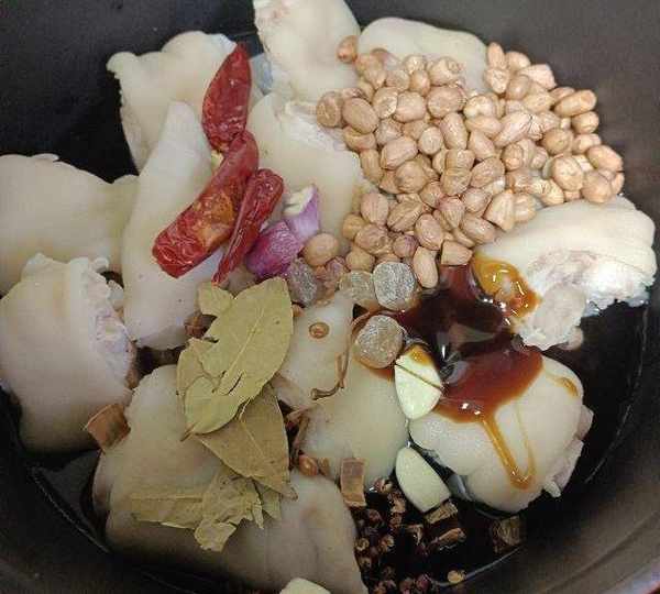 原料:豬蹄、花生、黃豆醬、香葉、桂皮、生抽、老抽、冰糖、大料、八角、料酒、蒜、紅椒、鹽、蠔油、蔥、薑。
