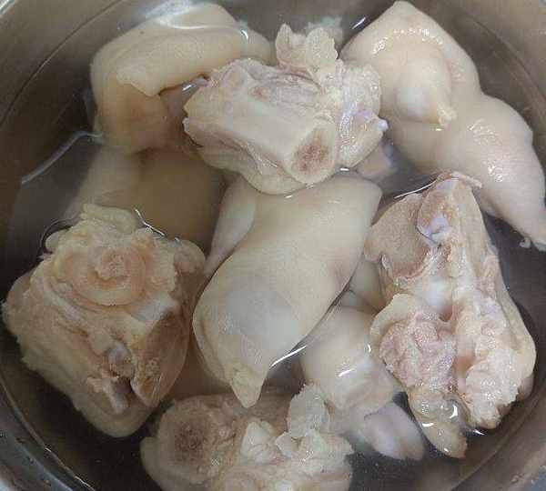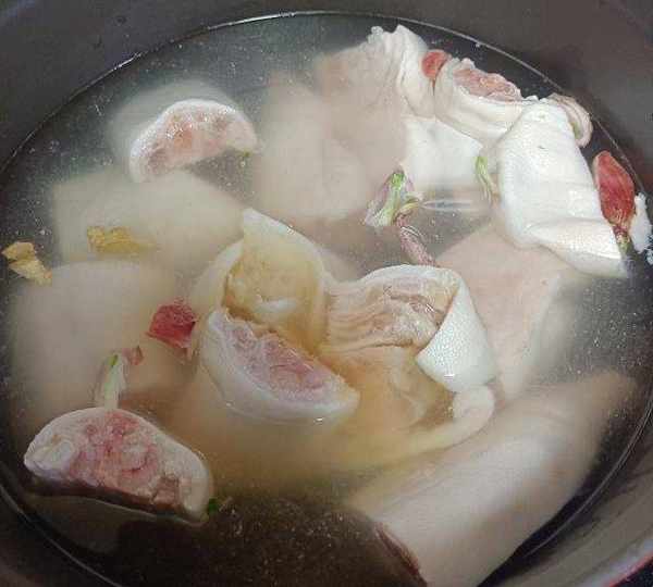 第1步、豬蹄冷水下鍋加蔥薑料酒去腥。